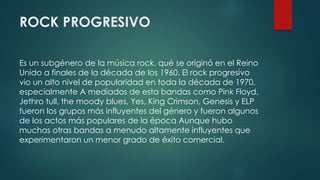 El documento habla sobre el rock progresivo, un subgénero del rock que se originó en el Reino Unido a finales de los 1960. Describe algunas de las bandas más influyentes del género como Pink Floyd, King Crimson, Genesis, Jethro Tull y The Moody Blues. Luego proporciona más detalles sobre la historia y música de Pink Floyd, King Crimson, Caravan y Genesis.