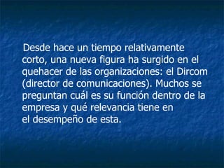 El documento describe el rol del director de comunicaciones (Dircom) en una organización. El Dircom es un profesional de la comunicación que conoce la organización internamente y en sus relaciones externas, e influye en su desarrollo. Sus funciones incluyen analizar la coherencia entre lo que la organización quiere comunicar y lo que realmente comunica, apoyar a todas las áreas de la organización, mantener capacitado al personal, y monitorear permanentemente el entorno. El Dircom debe usar la comunicación para conectar todas las áreas y optimizar los proces