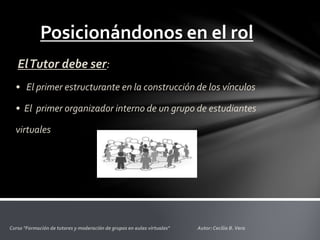 El documento describe las funciones y competencias de un tutor virtual. Un tutor debe establecer vínculos entre estudiantes y contenidos de manera reactiva o proactiva. También debe tener en cuenta los aspectos psicosociales, académicos y organizativos de los estudiantes. Un tutor necesita desarrollar habilidades de comunicación, orientación y motivación para crear una comunidad de aprendizaje virtual efectiva.