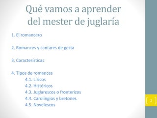 Este documento resume los diferentes tipos de romances que se desarrollaron en la literatura española medieval y renacentista. Explica que existen romances viejos anónimos del siglo XIV al XV y romances nuevos cultos de autores conocidos desde el siglo XVI al XVII. Describe las características formales de los romances y clasifica los principales tipos en líricos, históricos, juglarescos, carolingios, bretones y novelescos, dando ejemplos representativos de cada categoría.