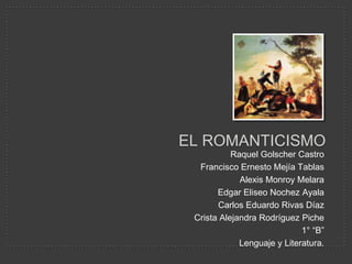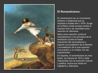 El documento describe el movimiento romántico, incluyendo su origen a finales del siglo 18 como reacción al neoclasicismo, sus principales representantes como Lord Byron, Victor Hugo y Alejandro Pushkin, y sus temas como la naturaleza, la libertad y la evasión de la realidad.