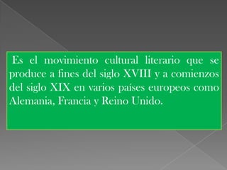 El romanticismo fue un movimiento cultural y literario que surgió a fines del siglo XVIII y comienzos del XIX en Europa. Se caracterizó por oponerse a la razón de la Ilustración y exaltar la subjetividad, la naturaleza, lo sobrenatural y la historia nacional. En España se impuso en la década de 1830 y sus principales exponentes fueron Larra, Espronceda, Bécquer y Zorrilla en literatura, y el Duque de Rivas en teatro. El realismo posterior se alejó de lo fantástico para refle