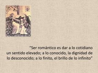 El documento describe el Romanticismo como una corriente literaria que se desarrolló en Europa durante la primera mitad del siglo XIX, caracterizada por la exaltación del yo individual, la búsqueda de la libertad y lo ideal, y temas como los sentimientos, la evasión, el folclore y el paisaje. El Romanticismo no solo fue un movimiento literario, sino una nueva forma de entender la política, el amor, el mundo y la vida.