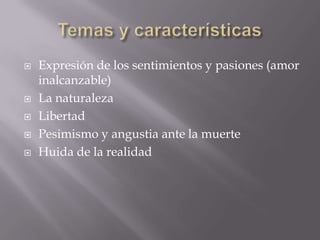 Este documento resume la vida y obra del poeta romántico español Gustavo Adolfo Bécquer. Habla sobre sus temas poéticos como el amor, la naturaleza y la libertad, y enumera algunas de sus obras más destacadas como "Rimas" y "Leyendas". También describe los rasgos del romanticismo como el lenguaje sonoro y los temas como el pesimismo.