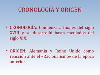 El Romanticismo comenzó a finales del siglo XVIII y se desarrolló hasta mediados del siglo XIX en Alemania y el Reino Unido como reacción al Racionalismo anterior. Las características del arte romántico incluyen el subjetivismo, la libertad, el nacionalismo, la religiosidad, la naturaleza, el irracionalismo y la evasión. La lírica romántica canta sobre el amor, el yo, la leyenda, la naturaleza y la libertad usando una variedad de métricas y lenguaje cer