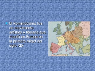 El Romanticismo fue un movimiento artístico y literario que surgió en Europa en el siglo XIX en reacción al racionalismo de la Ilustración. Se caracterizó por valorar la libertad individual, la originalidad creativa, la intensidad de sentimientos y la evasión a otras épocas y lugares. Autores como Lord Byron y Goethe fueron pioneros del Romanticismo con obras que expresaban rebelión y emociones a través de la naturaleza.