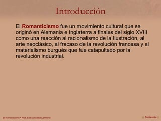 El documento resume el movimiento del Romanticismo en Europa a finales del siglo XVIII y principios del XIX. El Romanticismo surgió como reacción al racionalismo de la Ilustración y exaltó la subjetividad, la naturaleza, lo nacional y lo popular. Rechazó la razón en favor del sentimiento. El arte romántico idealizó temas como la muerte, lo primitivo y lo nacional, como se ve reflejado en pinturas de artistas como William Blake, Théodore Géricault, Francisco Goya y Eugene Delacroix.