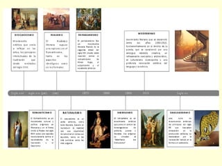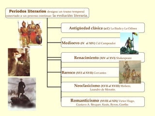 El documento describe diferentes períodos literarios desde la antigüedad hasta el romanticismo, indicando algunas de sus características y obras representativas. Se menciona que los períodos literarios designan tramos temporales conectados a la evolución literaria, y procede a enumerar algunos períodos como la antigüedad clásica, el medioevo, el renacimiento, el barroco, el neoclasicismo y el romanticismo junto con ejemplos de obras de cada uno.