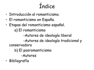 El documento resume las etapas del romanticismo en España. Se desarrolló en dos fases, el romanticismo propiamente dicho y el posromanticismo. El romanticismo tuvo dos tendencias, autores liberales como Espronceda y Larra que criticaron la sociedad, y autores tradicionales como Zorrilla. El posromanticismo se caracterizó por la poesía intimista y incluyó a autores como Rosalía de Castro y Gustavo Adolfo Bécquer.