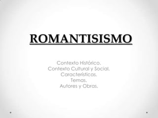 El documento resume el contexto histórico, cultural y social del Romanticismo, así como sus características, temas y autores más representativos. El Romanticismo surgió en Europa luego del Congreso de Viena y la Revolución Industrial, promoviendo la individualidad, la creatividad y lo diferente frente a lo común. Se caracterizó por valorar la naturaleza, la libertad, el amor idealizado y la crítica a la realidad desde pensamientos idealistas. Autores como Lord Byron, Víctor Hugo, G. Adolfo Bécquer y J