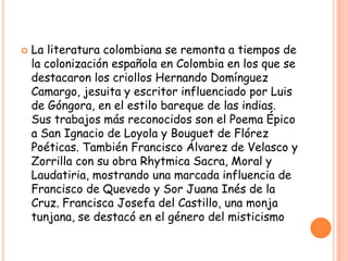 ![En la literatura de post-independencia ligado al romanticismo se destacaron Simón Bolívar, Antonio Nariño, José Fernández Madrid, Camilo Torres y Francisco Antonio Zea. En 1871 se estableció en Colombia la primera academia de lengua castellana en continente americano.[153] A principios del siglo XIX y principios del siglo se popularizó el género costumbrista, teniendo como máximos exponentes a](https://image.slidesharecdn.com/anagaba-110704142206-phpapp02/85/El-romantisismo-en-colombia-3-320.jpg)