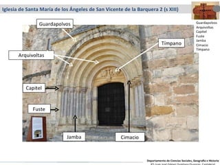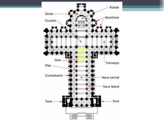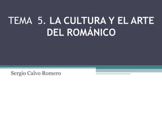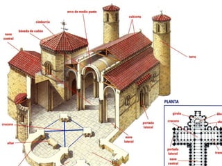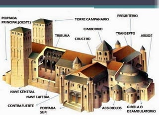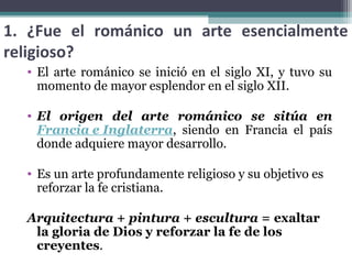 El documento describe el arte románico en Europa y España. Fue un arte esencialmente religioso que floreció entre los siglos XI y XII, con el objetivo de reforzar la fe cristiana a través de la arquitectura, pintura y escultura. La arquitectura románica se caracterizó por el uso del arco de medio punto, bóvedas de cañón y contrafuertes. La pintura y escultura románicas tenían un propósito didáctico y representaban escenas bíblicas de forma plana y simbó