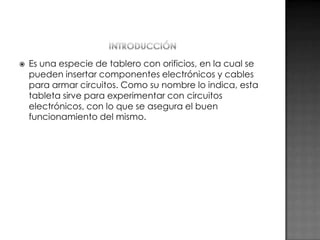 Un protoboard es una tabla con orificios para insertar componentes electrónicos y cables para armar circuitos de forma experimental. Tiene laminillas metálicas debajo de la cubierta plástica que permiten la conexión eléctrica entre los componentes insertados. Se usa para probar circuitos antes de construirlos de forma permanente, ya que permite modificarlos fácilmente sin necesidad de soldadura.