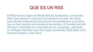 Este documento explica qué es RSS, cómo funciona y para qué se utiliza. RSS (Really Simple Syndication) es un formato XML para compartir contenido en la web que permite a los usuarios suscribirse a fuentes de información y recibir actualizaciones de manera frecuente sin necesidad de un navegador. Los lectores RSS revisan sitios suscritos por el usuario para verificar la existencia de nuevo contenido de manera similar a un lector de correo electrónico. RSS se utiliza generalmente para publicar titulares de noticias, entradas de blog y otra inform