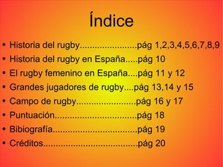 El documento proporciona una historia detallada del origen y desarrollo del rugby a nivel mundial y en España. Explica que el rugby se cree que surgió en Inglaterra en 1823 y luego se extendió a otros países, con reglas formales establecidas en 1871. También describe la evolución del juego y las competiciones importantes como la Copa del Mundo, así como el crecimiento reciente del rugby femenino en España.