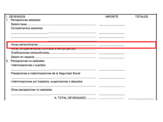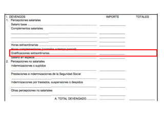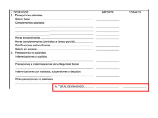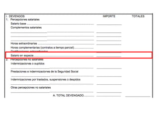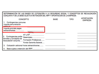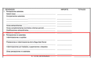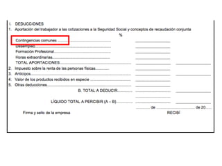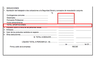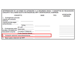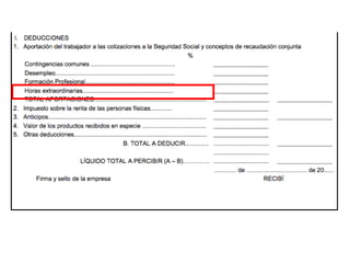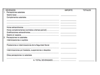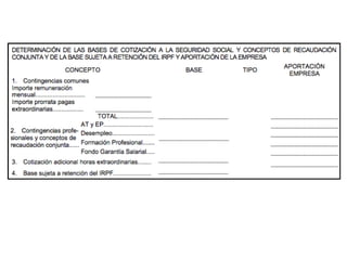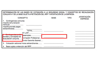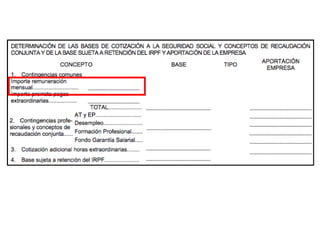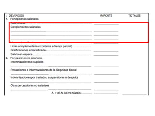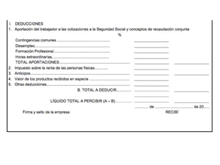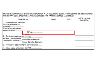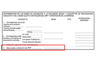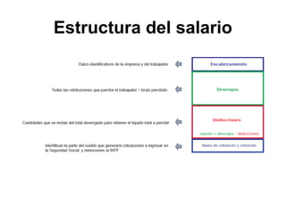 El documento describe los diferentes componentes de la estructura salarial de un trabajador, incluyendo el salario base, complementos salariales como primas e incentivos, y deducciones como aportaciones a la seguridad social. Explica los conceptos de bases de cotización, cuotas empresariales, deducciones por impuestos y cómo calcular el salario líquido total.