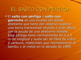 El salto con pértiga es una prueba de atletismo que consiste en superar una barra transversal situada a gran altura con la ayuda de una pértiga flexible de 4 a 5 metros de longitud. Los atletas disponen de tres intentos por altura y deben mostrar velocidad, fuerza en la espalda y habilidad gimnástica. Sergéi Bubka fue el primero en superar los 6 metros y estableció 35 récords mundiales entre 1983 y 1997.