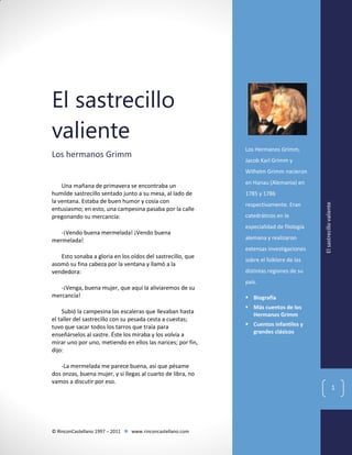Este cuento de hadas de los Hermanos Grimm narra las aventuras de un sastrecillo valiente que mata a siete moscas de un golpe. Luego cose un cinturón que dice "Siete de un golpe" y sale al mundo para demostrar su valentía. En el camino se enfrenta a un gigante al que vence en varias pruebas de fuerza, y luego pasa la noche en la cueva de los gigantes. Al final llega al jardín real y es contratado por el rey para servirlo.