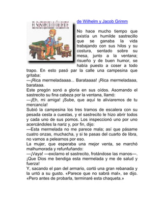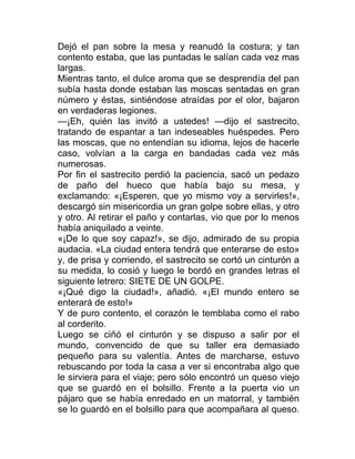 Este cuento relata la historia de un pequeño sastrecillo que se embarca en un viaje después de matar a siete moscas de un golpe. En su viaje, se enfrenta y vence a un gigante a través de su ingenio y astucia. Más tarde, es invitado a la cueva del gigante donde pasa la noche. Al día siguiente, es contratado por el rey para deshacerse de dos gigantes que asolan el bosque real a cambio de la mano de la princesa y la mitad del reino. El sastrecillo a