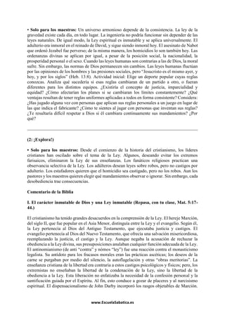 El documento aborda la idea de que la ley de Dios es perpetua e inmutable, resaltando su importancia en la comunicación de la salvación y la consistencia del carácter divino. Se sugiere que, aunque la obediencia no es innata en el ser humano, el Espíritu Santo puede otorgar fuerza para cumplir con la voluntad divina. Además, se discuten las implicaciones de vivir de acuerdo con la ley y la necesidad de fomentar un entendimiento positivo de sus mandamientos en la comunidad cristiana.