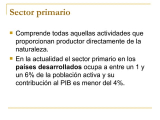El sector primario incluye actividades como la agricultura, ganadería, pesca y explotación forestal. Comprende la obtención de productos directamente de la naturaleza. En países desarrollados emplea a un pequeño porcentaje de la población pero su contribución al PIB es baja, mientras que en países en desarrollo es una actividad más importante que ocupa a más de la mitad de la población y aporta más del 10% al PIB.