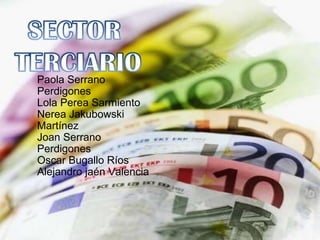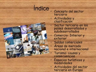 Este documento proporciona información sobre el sector terciario o de servicios. Explica que incluye actividades como el comercio, transporte, comunicaciones, turismo, sanidad y educación. Describe las diferentes clasificaciones y actividades del sector terciario en Europa y cómo es la principal actividad económica del continente, aportando el 78% del PIB. También resume los diferentes tipos de transporte, medios de comunicación, turismo y comercio.