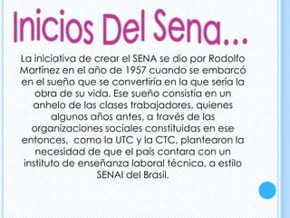 El Servicio Nacional de Aprendizaje (SENA) fue creado en 1957 por iniciativa de Rodolfo Martínez para ofrecer formación profesional gratuita a los trabajadores colombianos y contribuir al desarrollo económico y social del país. SENA nació durante el gobierno militar mediante el Decreto-Ley 118 con el fin de descentralizar la formación del Estado y financiarla de manera autónoma.
