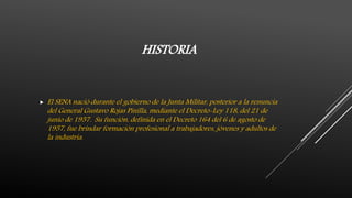 El SENA es un establecimiento público de formación profesional en Colombia encargado de capacitar trabajadores. Fue creado en 1957 para brindar formación técnica y ha contribuido al desarrollo social y económico del país. Su visión es convertirse en una entidad líder mundial en formación profesional para 2020.
