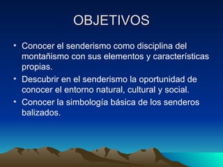 El documento describe los objetivos, características y tipos de senderismo. El senderismo tiene como objetivo principal disfrutar de la naturaleza caminando por senderos. Se caracteriza por no requerir habilidades técnicas ni equipamiento especializado. Los senderos se clasifican según su anchura, desnivel, longitud y dificultad. Se señalizan para guiar a los senderistas de forma segura.
