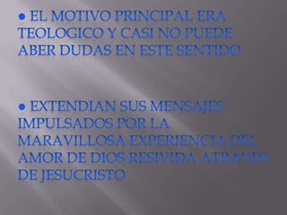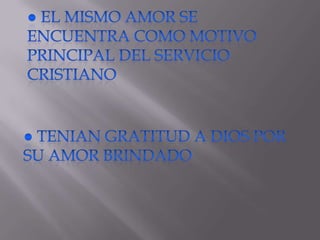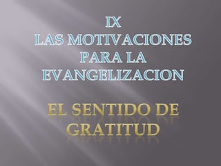 El documento describe varios factores que impulsaron a los cristianos primitivos a la evangelización. No fue la gran comisión, sino el ejemplo de Jesucristo. Pablo y Pedro sintieron la responsabilidad de compartir el evangelio por su relación con Dios. A pesar de ser un perseguidor de la iglesia, Pablo recibió misericordia de Dios para predicar el evangelio. La gratitud, devoción y dedicación a Dios por su rescate en la cruz fue lo que motivó a la iglesia antigua a evangelizar.