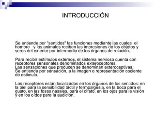 El documento describe los diferentes tipos de receptores en la piel que permiten percibir sensaciones táctiles como el contacto, la presión, el calor y el frío. Explica que los corpúsculos de Meissner, Krause, Ruffini, y Pacini se encuentran en diferentes capas de la piel y son responsables de detectar estímulos como el tacto fino, el frío, el calor y la presión, respectivamente. También menciona que las terminaciones nerviosas libres detectan el dolor.