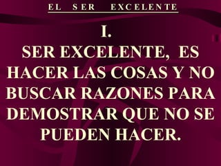 Este documento presenta trece definiciones del autor Miguel Angel Cornejo y Rosado sobre lo que significa ser excelente. Ser excelente se define como hacer las cosas sin buscar excusas, producir oportunidades para alcanzar el éxito, lograr objetivos a pesar de circunstancias a través de disciplina y aprendizaje, asumir responsabilidad por los errores, y trascender el propio tiempo para dejar un mundo mejor.