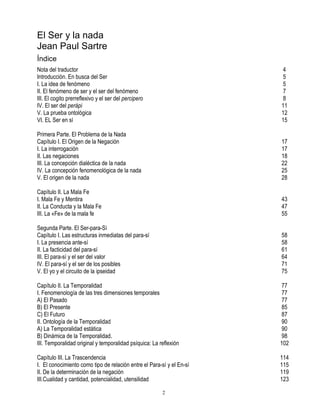 Este documento presenta una introducción al libro "El ser y la nada" de Jean-Paul Sartre. En la introducción, Sartre discute cómo la filosofía moderna ha reducido lo existente a las apariciones que lo manifiestan para eliminar dualismos problemáticos. Sin embargo, esto introduce un nuevo dualismo entre lo infinito y lo finito, dado que cada manifestación requiere ser trascendida hacia la serie infinita total de manifestaciones para que el objeto sea captado como trascendente. El fenómeno es a la vez finito en sí mismo