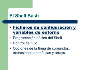 Este documento resume los principales conceptos del lenguaje de programación Shell Bash, incluyendo ficheros de configuración, variables de entorno, programación básica con funciones y scripts, y control de flujo. Explica cómo configurar variables como PS1 y PATH, y cómo crear y ejecutar funciones y scripts Shell para automatizar tareas.