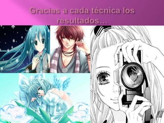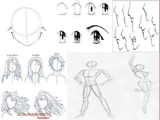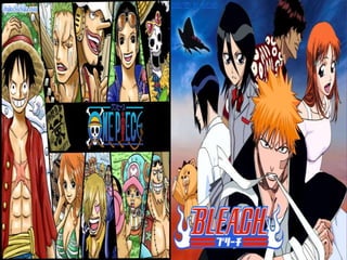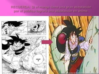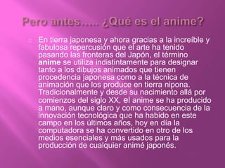 El documento habla sobre los términos anime y manga en el contexto japonés. Explica que anime se refiere a los dibujos animados japoneses y la técnica de animación, aunque originalmente eran a mano y ahora también se usa la computadora. Manga se refiere a los cómics japoneses, uno de los principales entretenimientos en Japón. Luego describe los características comunes de los personajes en anime como ojos y cabellos de colores variados y cuerpos más esculturales. Finalmente menciona los gé