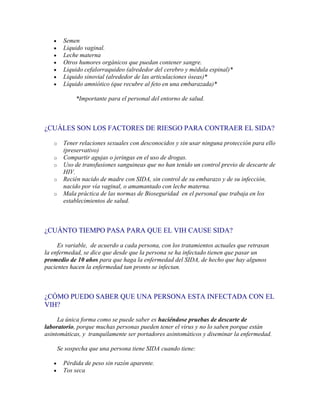 El documento resume información sobre el SIDA/VIH, incluyendo qué es, cómo se contagia, los factores de riesgo, síntomas, pruebas de detección, tratamiento y prevención. Explica que el SIDA es causado por el virus VIH y debilita el sistema inmunológico, y que se puede contagiar a través de relaciones sexuales sin protección, compartir agujas u otros fluidos corporales infectados.