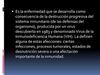 El SIDA es causado por el virus VIH que destruye progresivamente el sistema inmunológico. Se transmite principalmente a través de relaciones sexuales sin protección, transfusiones de sangre, y de madre a hijo. Aunque no existe una cura, los tratamientos con medicamentos antirretrovirales pueden controlar el virus y prevenir el desarrollo del SIDA, prolongando la vida de los pacientes.