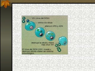 El documento resume la información básica sobre el SIDA/VIH. Explica que el VIH destruye las células inmunitarias CD4, debilitando el sistema inmune y dejando al cuerpo vulnerable a otras enfermedades. Describe los factores de riesgo como relaciones sexuales sin protección y el compartir agujas, así como los síntomas como diarrea y pérdida de peso. Finalmente, cubre el diagnóstico a través de pruebas de sangre y el tratamiento con medicamentos antirretrovirales.
