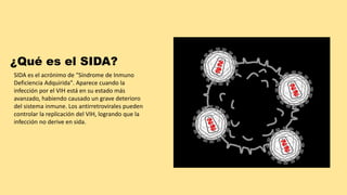 El documento describe el SIDA y el VIH. Explica que el SIDA es el estadio más avanzado de la infección por VIH, que causa un deterioro del sistema inmune. Además, proporciona datos sobre la pandemia de VIH/SIDA, incluyendo que afecta a más de 38 millones de personas y ha causado 39 millones de muertes. Finalmente, resume formas de prevenir la transmisión del VIH, como usar preservativos y la profilaxis post-exposición.