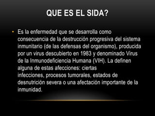 El SIDA es una enfermedad causada por la destrucción del sistema inmunológico por el Virus de Inmunodeficiencia Humana (VIH). El VIH debilita las defensas del cuerpo dejándolo vulnerable a infecciones e incluso cáncer. El SIDA no es hereditario sino que resulta de la exposición al VIH, el cual se transmite principalmente a través de relaciones sexuales sin protección, transfusiones de sangre, y de madre a hijo durante el embarazo o parto.