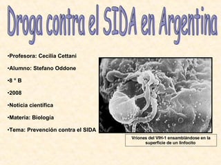 Un nuevo medicamento llamado maraviroc se presentó en Argentina para tratar el SIDA. Maraviroc impide que el virus VIH ingrese a los linfocitos bloqueando su unión a un receptor celular llamado CCR5. Esto evita que el virus infecte más células. La droga estará disponible en los próximos meses para pacientes con VIH en etapas avanzadas y que no responden a otros tratamientos. Se estima que podría beneficiar entre el 3% y 7% de las 36.000 personas que reciben tratamiento contra el SIDA en Argentina.