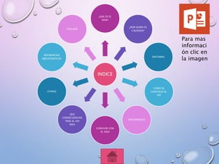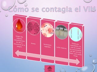 Este documento proporciona información sobre el VIH y el SIDA, incluyendo una definición de cada término, los síntomas, cómo se transmite, tratamientos disponibles, convivir con la enfermedad, consecuencias, etapas y referencias bibliográficas.