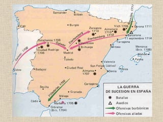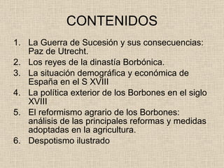 El documento resume la situación de España en el siglo XVIII bajo la dinastía Borbónica. Tras la Guerra de Sucesión, los tratados de Utrecht reconocieron a Felipe V como rey pero España perdió territorios europeos. Los Borbones centralizaron el poder e impulsaron reformas. La economía creció pero se mantuvieron problemas. La política exterior buscó recuperar territorios con alianzas francesas que llevaron a conflictos con otras potencias europeas.