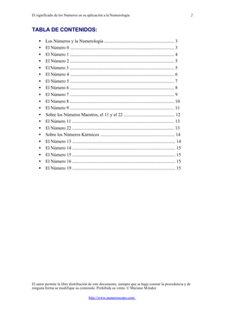 El documento describe los significados numéricos de los números del 0 al 9 y algunos números especiales como el 11 y el 22. Explica que cada número se asocia con una idea arquetípica y describe las características positivas y negativas de cada número. El documento proporciona información sobre la aplicación de la numerología para analizar la personalidad y el destino de las personas.