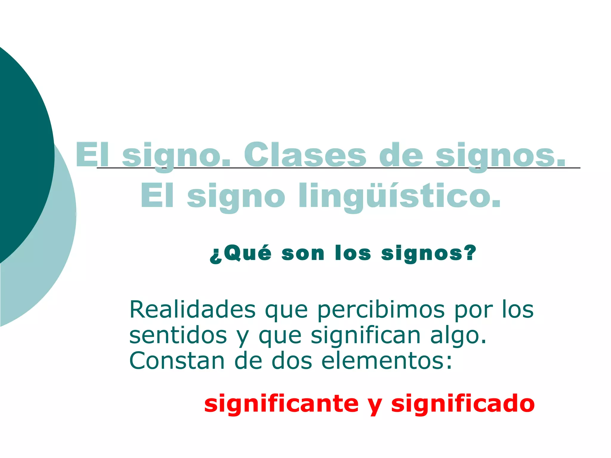 Los signos se componen de dos elementos: el significante y el significado. El significante es la parte material perceptible por los sentidos, mientras que el significado es el concepto o idea que evoca la percepción del significante. Existen tres clases de signos: síntomas o indicios que no tienen intención comunicativa; iconos que presentan semejanza con el referente; y símbolos que representan otras realidades de forma convencional. El signo lingüístico utilizado en las lenguas también se compone de significante y significado, y se caracteriza por ser arbitrario,