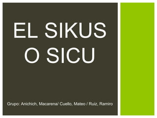 El documento describe el sikus, un instrumento musical andino compuesto de tubos de caña de diferentes longitudes. Explica que se fabrica cortando trozos de caña nudos, limando los extremos y atándolos en hileras. Se usa soplando en los agujeros para producir sonido. Tiene un valor de $200-$1500 y se originó en la cultura Huari del Perú hacia el siglo V.