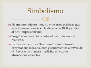 El simbolismo fue un movimiento literario y artístico que surgió en Francia en la década de 1880 en reacción contra el naturalismo y el realismo. Se caracterizó por la expresión de ideas y sentimientos a través de símbolos e imágenes en lugar de afirmaciones directas. En literatura tuvo sus orígenes en la poesía de Baudelaire y se difundió a través de Mallarmé, mientras que en pintura los artistas buscaron sugerir realidades espirituales a través de figuras simbólicas. Autores represent
