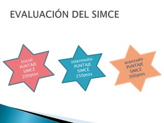 Este documento resume la historia de las pruebas estandarizadas en Chile desde la década de 1960 hasta la actualidad, incluyendo el Sistema de Medición de la Calidad de la Educación (SIMCE) que se implementó en 1988 y actualmente mide logros en lenguaje, matemáticas, ciencias e historia. El documento también cuestiona lo que realmente mide el SIMCE y cómo ha cambiado la percepción de estas pruebas con el tiempo.