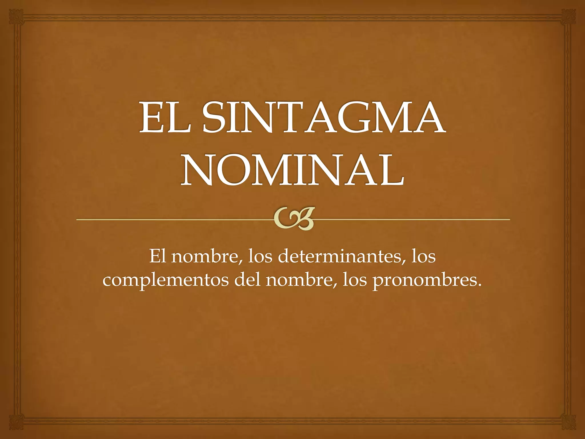 Este documento describe los diferentes tipos de sintagmas y palabras que acompañan al nombre, incluyendo determinantes, adjetivos, complementos del nombre y pronombres. Explica que un sintagma es un grupo de palabras gobernadas por un núcleo que tiene una función sintáctica. Luego describe las clases de determinantes y sus funciones, los tipos y grados de adjetivos, y las clases de pronombres.