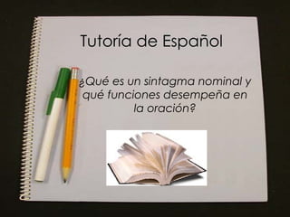 El documento habla sobre el sintagma nominal en español. Explica que un sintagma nominal está formado por un núcleo, generalmente un sustantivo, y puede incluir determinantes y modificadores. Describe las partes del sintagma nominal, incluyendo el núcleo, modificadores directos e indirectos, y determinantes. También explica las funciones principales de un sintagma nominal dentro de una oración, como sujeto, atributo, y complemento del verbo.